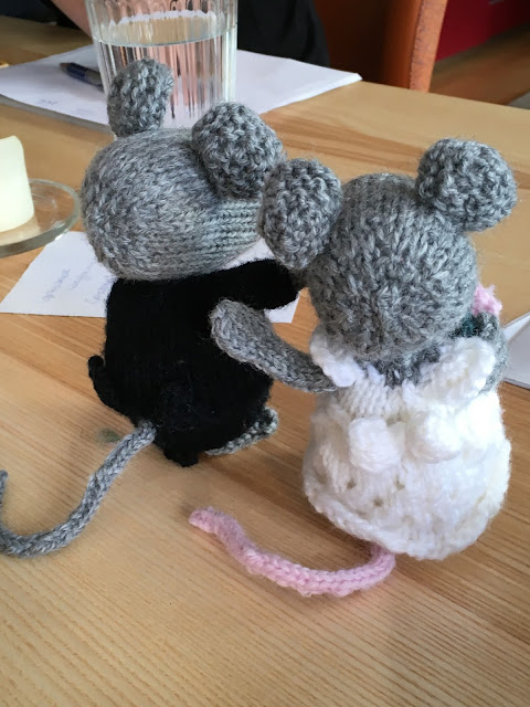 Ein Bild von den Mäusen - der Bräutigam will nicht so recht allein stehen. Was überhaupt keinen Zusammenhang oder Beziehung mit dem echten Bräutigam hat, der mit beiden Beinen fest auf der Erde steht. Ich habe ihm jetzt eine kleine Stütze unter den Po gestrickt, so sollte es gehen...